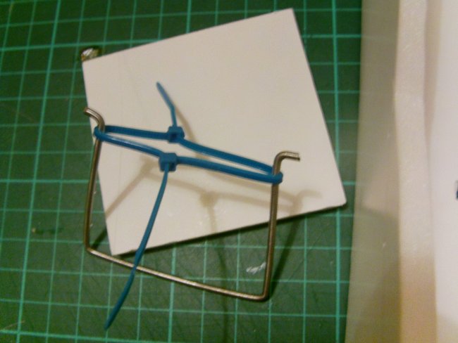 Here’s a test fit with the metal frame held together with zip-ties. Next stage is to join the overlapping portion with thread and CA glue.