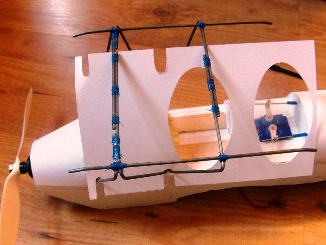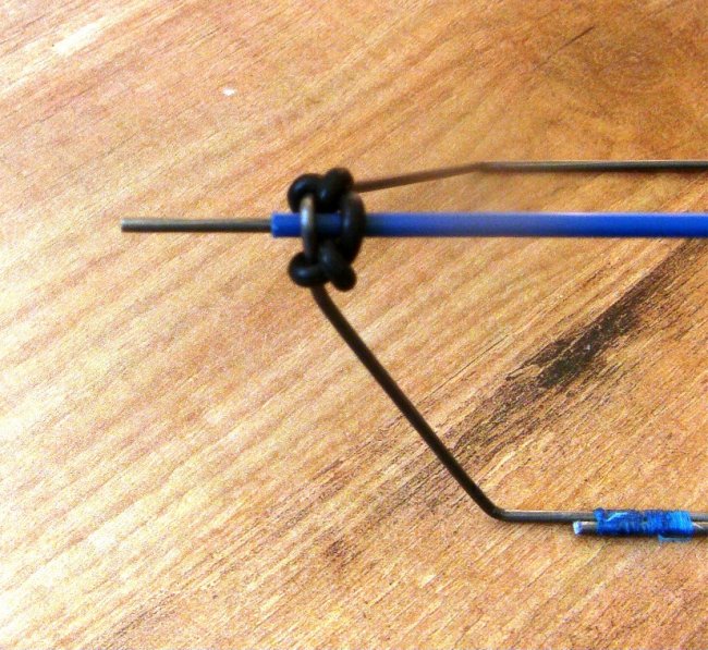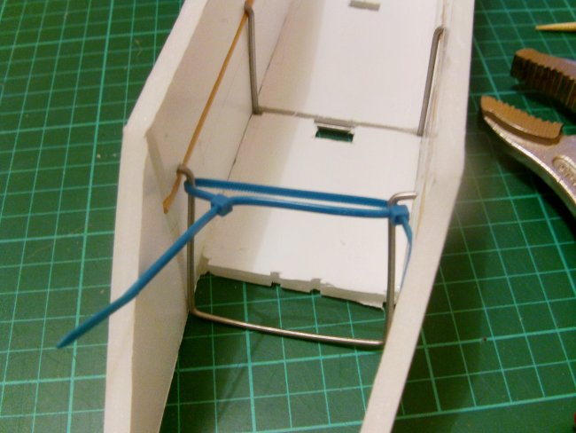 To get the wire in place you need to stop the ends sticking out and catching the fuselage sides. This is done by pulling the mount’s legs together against the natural spring in the wire. I’ve used zip-ties for this. Now you can see why I moved the skewer further down the fuselage, it allows the legs to be longer. If these legs were too short it would be impossible to get them to bend and still spring back into shape.