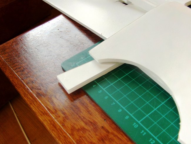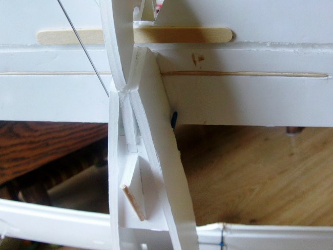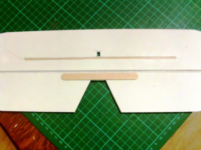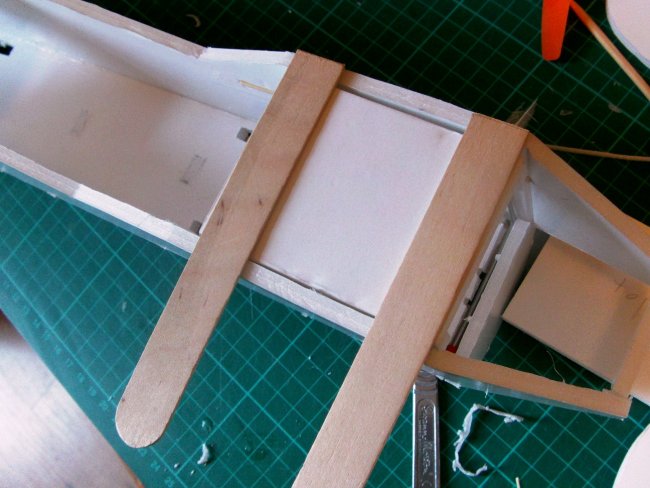 The tongue depressors are cut to length so that they project enough to sit on the fuselage sides.