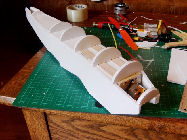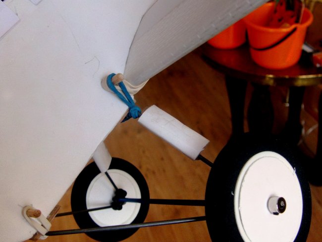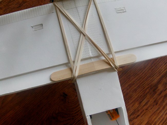 I glued-on a tongue depressor to reinforce where the elastics go over the back of the wing.