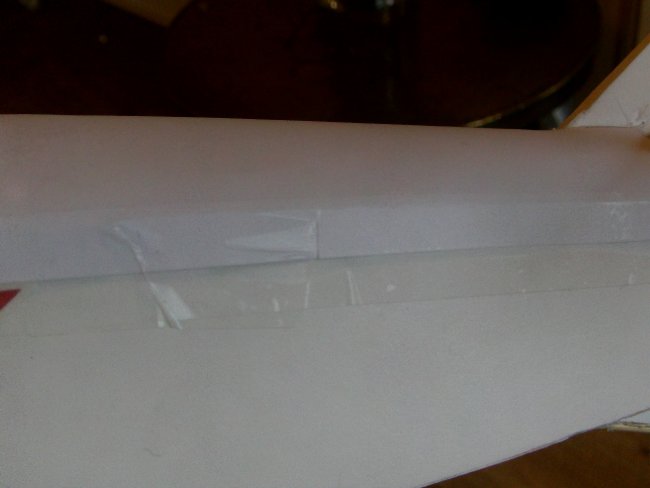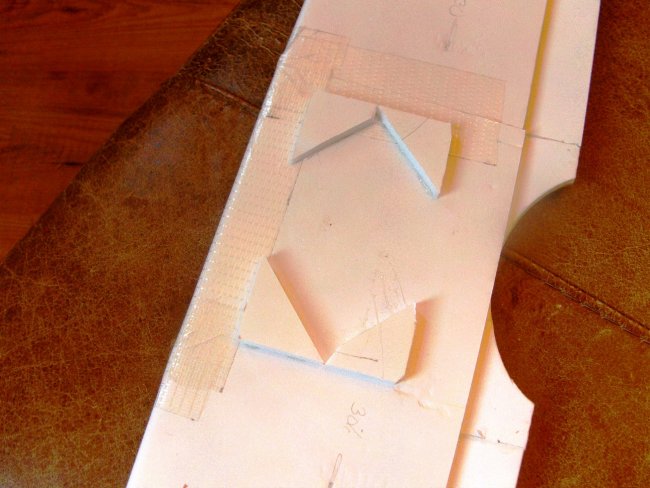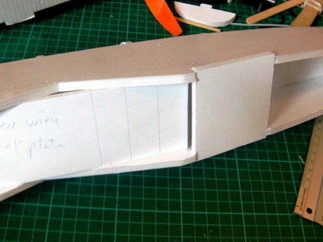 The turtle-decks are poster paper, taped and glued using the familiar Flite Test system. Start at the tail and work forward. I was a bit quick and missed the photographs of this stage, but here’s the template in position, showing how the back section centres around the vertical stabiliser.
