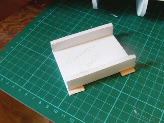 Mounts installed. As with all the builds using a removable power pod, now is a good time to fit your CUSTOM pod to get the exact position of the tabs and slots. I only later decided on a custom pod, so read ahead, see what this looks and make it up now! The tabs should locate in the normal positions shown, but if your pod is slightly wider or narrower it’s not so easy to squeeze it into place - better to make it fit now. This first turtle deck former closes the slot for the front cabane mount, so I installed it to keep the mount in place.