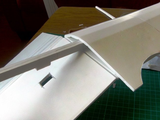 Now you want to fit the wing top panel. As it comes over you need to trim away material to get a flush fit. Do this bit-by-bit, gently laying the wing panel over the centre section and marking material to be removed.