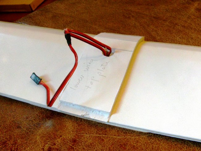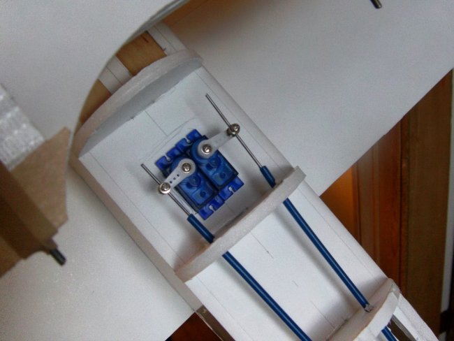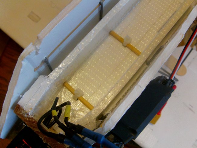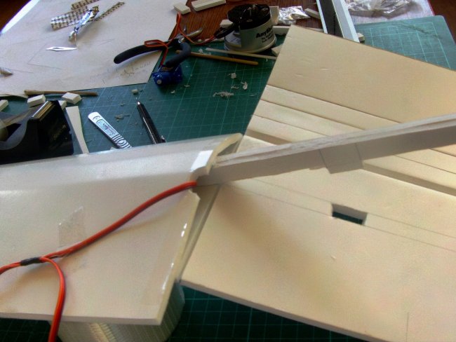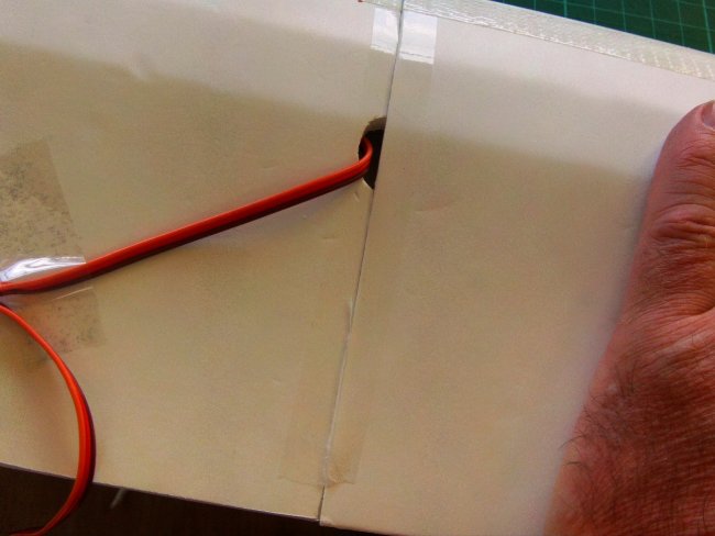 Once you have a good fit, feed/join your servo wires and glue down the second wing half.