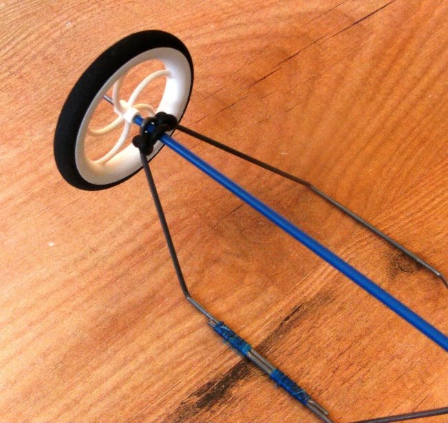This undercarriage system uses rubber bands or prop rings to hold the axle in place and provide a little suspension. Not essential but I use a length of control rod snake to make a sleeve to cover most of the axle. The wheel can’t go over the sleeve, so this helps to keep the wheel from rubbing against the suspension rubber. A washer would work as well. Note that the last 15mm of that bottom corner of the frame has been bent to make it near-enough vertical, again to stop the ‘pointy’ end of the frame digging into the side of the wheel. A lesson I learned from ‘chewing-up’ the insides of my AVRO wheels.