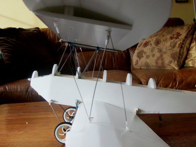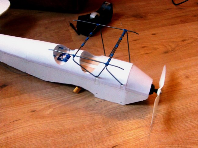 Bend up your three cabane frame wires and the two top wing support rails, and then fit the frames to the fuselage.