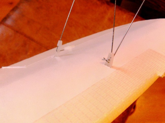 I cut and shaped short sections of tongue depressor to reinforce the back edge of the wing for the elastics.