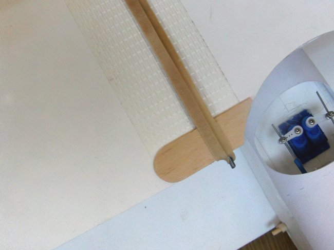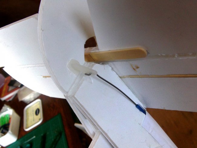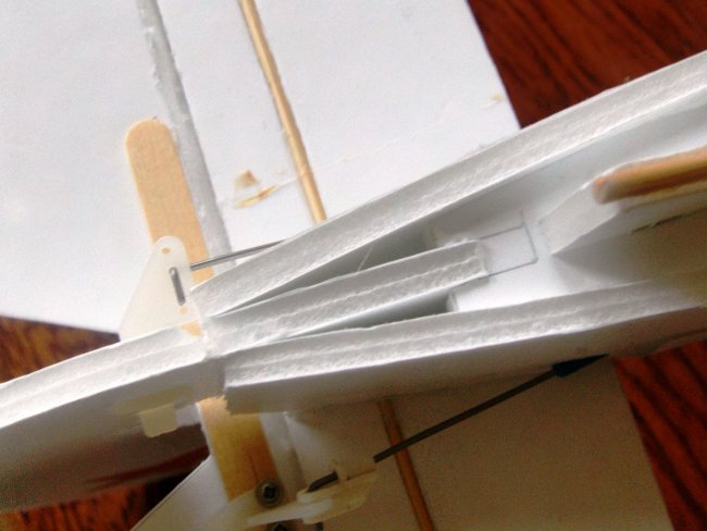 Not much more to do. Here’s the aileron cut free, the hinge bevelled and reinforced with hot glue, and the control horn connected up to the servo. Again I forgot to cut the bevel on the other side to make more space for the control horn.