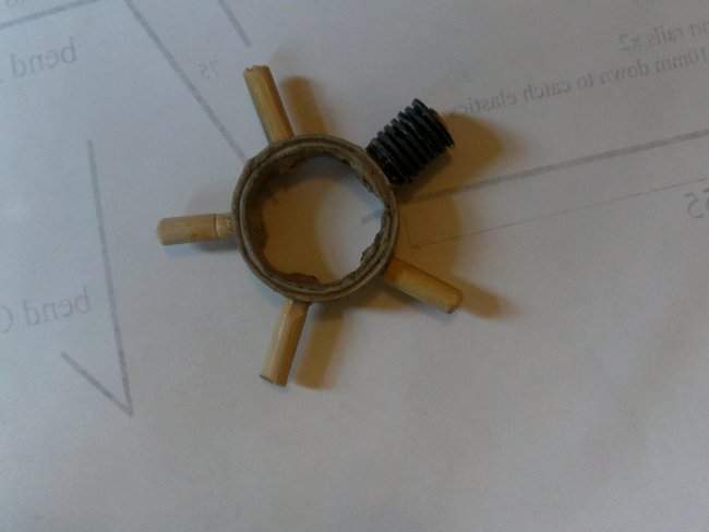 The only other addition to the plane is the dummy motor. Each engine cylinder is made-up from a stack of two different sizes of black nylon washers glued to a short piece of dowel. The dowels are first glued into a thick cardboard ring.