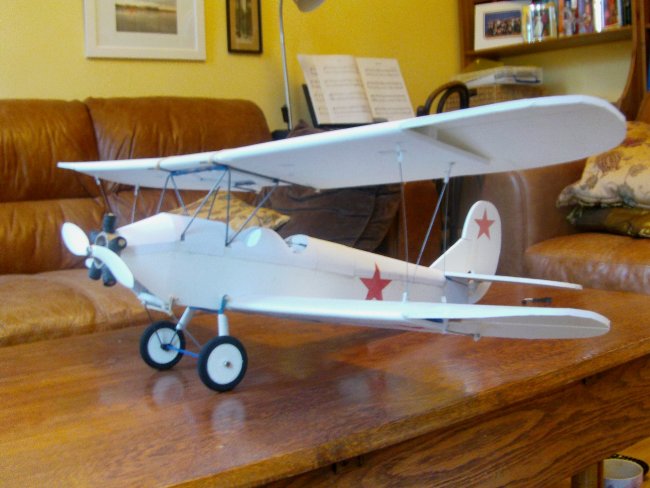 I printed the Russian stars onto self-adhesive parcel labels and cut them out and stuck them on. By a lucky coincedence, this 'everything white' finish is the winter colours for this and many other Soviet planes during WW2. I’ve seen a version of this plane with skis fitted to the existing undercarriage frame, and that might be a fun mod for winter flying. There's also a float plane version, and if someone had the patience to waterproof everything, this would make a great seaplane. On mine, everything has been sprayed with mat varnish, which will keep off most of the dew-damp and fog I encounter.