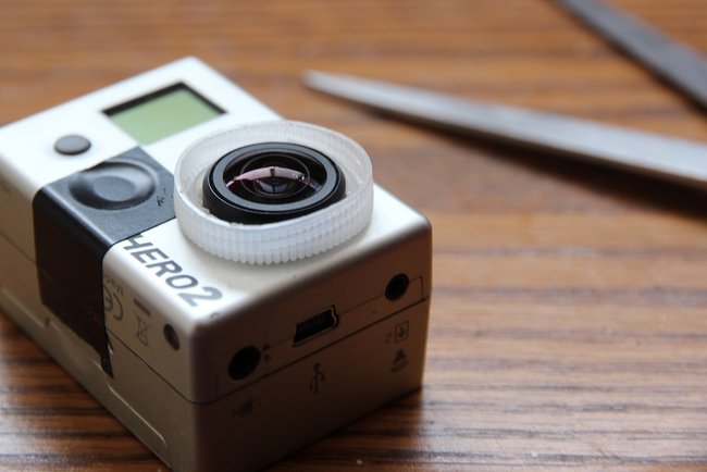 Basically, cut out the top of the water bottle lid so that it has a hole the size of the GoPro lens.
