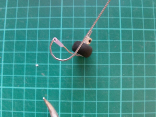 Now we want to bring that wire around so that we can fix it to the rudder. Put your pliers here and make a small bend.