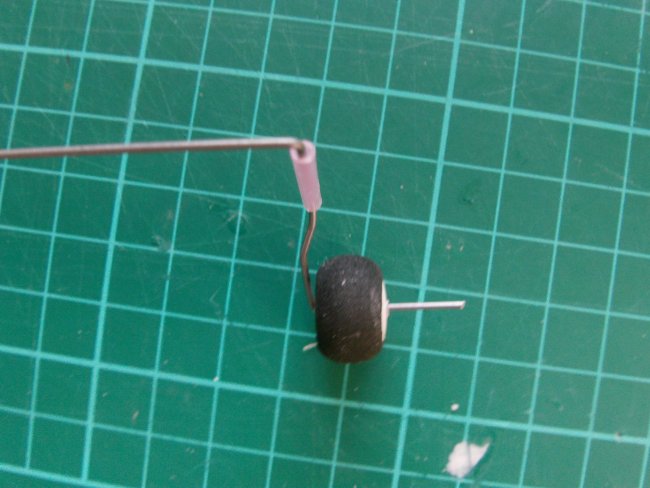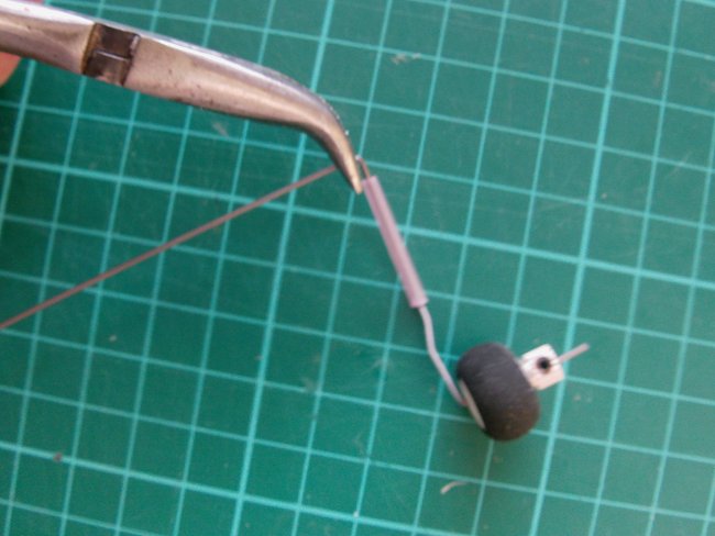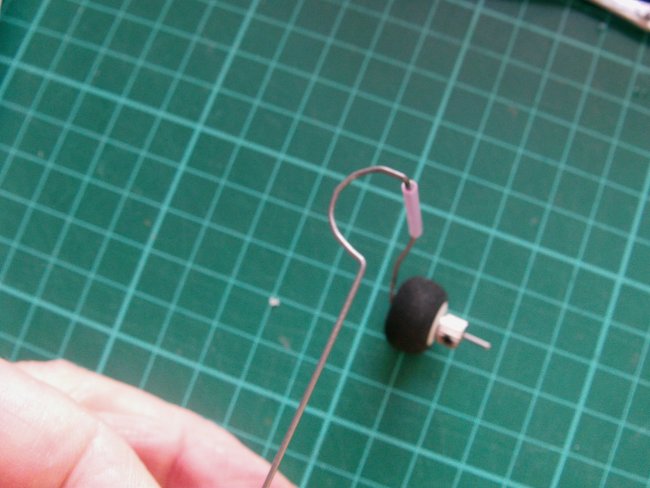 Cut the wire so that you have a reasonable length of lever to act on your wheel. Now cut a little length of cotton bud tube to fit over the wire. One of the VERY important things about this system is that the steering/tiller wire is quite a sloppy fit in the tube. Without a little play, the system will seize up. UPDATE - I've discovered some cotton buds have smaller diameter holes, which works well as the hinge tube but not as the steering/tiller tube. If this is the case either stretch the tube or find a slightly larger tube (ink reservoir tube in a ball point pen). Once the hinge tube is in place a little final adjustment is usually needed to get the last straight section of the wire to sit in line with the rudder (as in the picture above). You want a good ‘rattly’ fit. The steering tube should be kept about 6mm (1/4 inch) away from the loop. When the rudder moves the wire actually slides in and out of this tube – just a couple of mm’s, but it needs that movement.