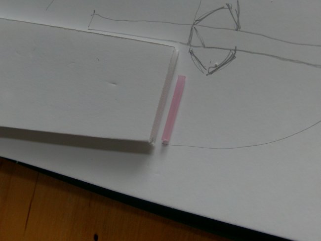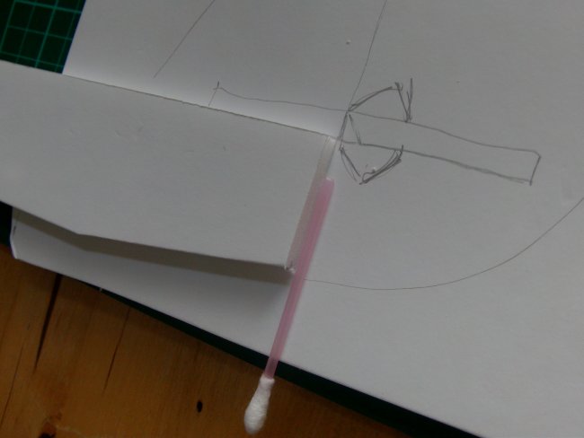 Here’s a mock-up of the back of your typical foam board build. A short length of tube from the cotton bud will become the hinge for the steering. You’ll be fitting the tube on the opposite side to your bevel – this keeps the hinge point of the rudder and the steering as close to each other as possible. If your bevel is on this side (as you look at my mock-up) you’ll need to think it through and reverse all the bends so that you can fit the assembly on the other side of the rudder.
