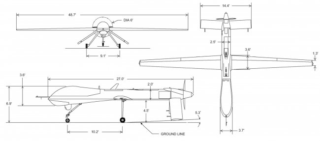 I think the first and most important reason is that the Foam Board UAV is NOT a scale model of any full-size drone. Yes, it took inspiration from the “Predator” and “Reaper” drones but at no stage did I look at a 3-view (like the one above) and take measurements that were then translated to the model design. Let’s take a look then at some of the problems I faced and see if we can learn anything from the real thing…