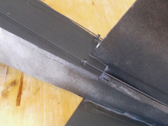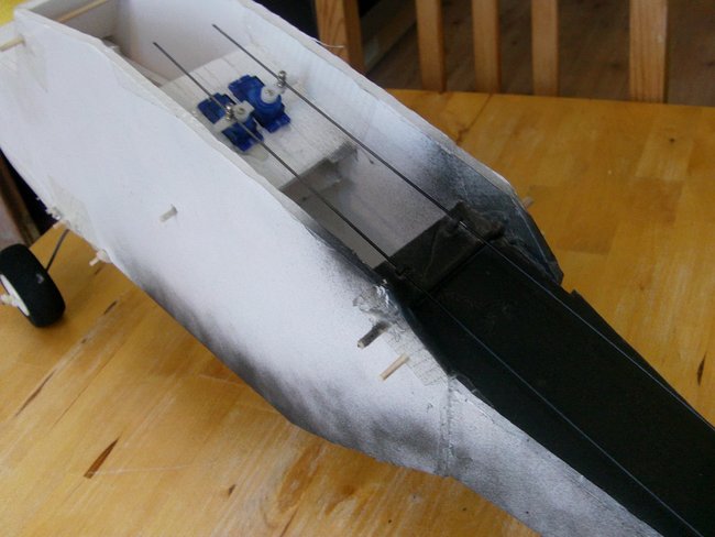 …and long enough at the front to extend under the wing to give a strong connection to the main fuselage. The last part of the pad needs to step-in so that it fits between the sides. I re-led the control rods, running them over the new panel.