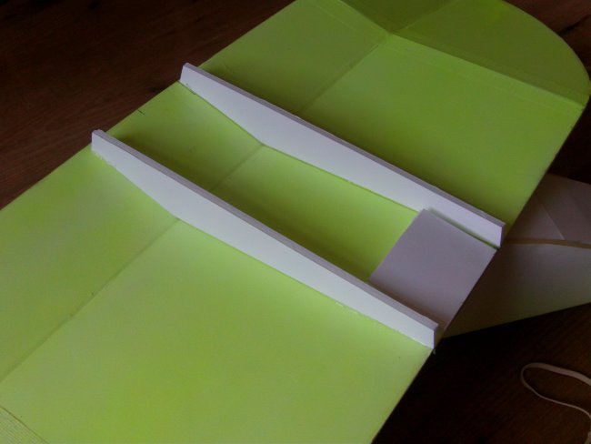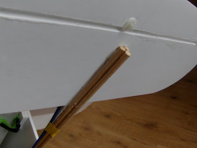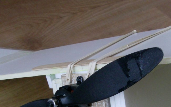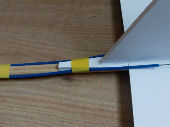 I decided to reduce the Angle of Incidence by lifting the back of the wing. First I reinforced the wing to replace the stiffening the wing gets from the top of the fuselage. These stiffners straddle the fuselage and are a fairly loose fit. Then I placed a foamboard pad at the back of the wing to sit on top of the swappable pod mount - I had to glue the pad onto the wing to prevent the wing sliding backward in flight, as it could now slide over the top of the swappable pod and disconnect the rear elastics. I'm glad I spotted that! I doubt the fuselage would fly very well without the wing! This pad raises the wing by 6mm.