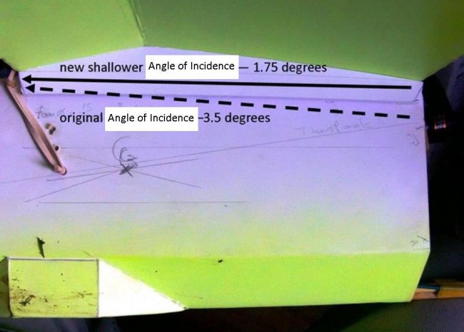 * 29/08/2014 - I reviewed this article and realised I was using the wrong term when discussing the modification to the wing. I was using Angle of Attack instead of Angle of Incidence. Angle of Attack refers to the angle that the wind is striking the wing and is influenced by the attitude of the whole aircraft in flight. Angle of Incidence is the difference between the straight line (baseline), which the horizontal stabiliser 'projects' along the fuselage, and the angle of the wing to this baseline. Some planes have zero Angle of Incidence, ranging through to quite high (10 degrees or more) for extremely slow flyers. For faster moving planes the Angle of Incidence is generally only a few degrees.