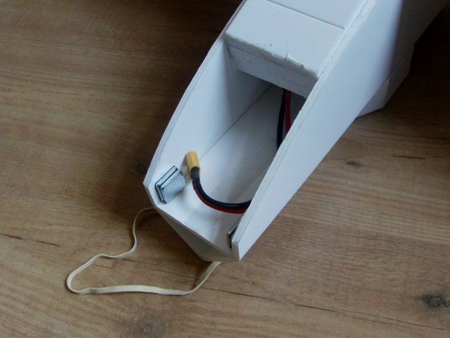 Here's the battery pod - my biggest battery is only 1000mah, so I had to add some weights. During the test flights I added even more weight - 50g in total. Depending on how the plane performs with some recent modifications, I might try doubling my batteries with a Y-harness and removing the weights. We'll see how it goes....