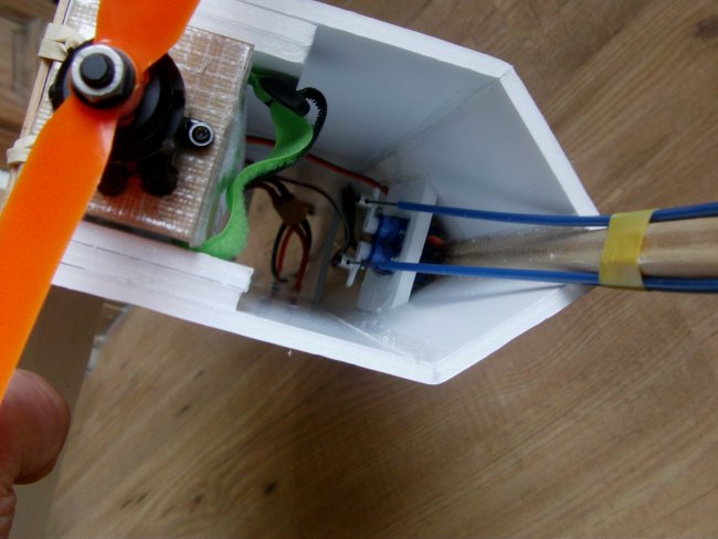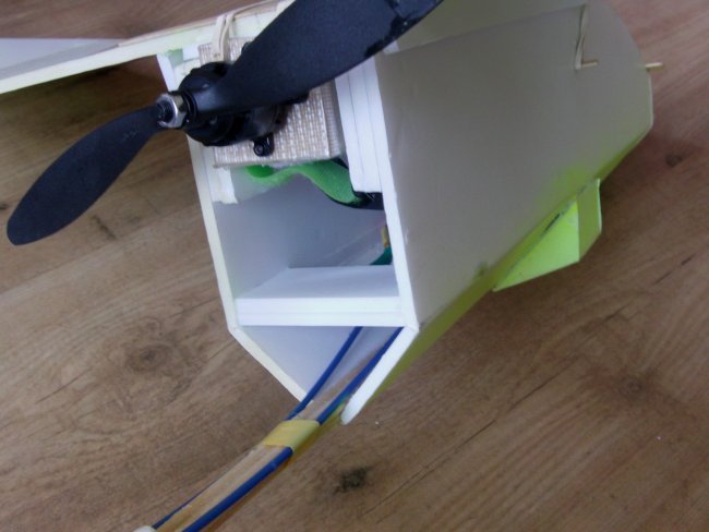 After its first flight (before the video) I felt the 8x4 prop was a bit anaemic with the 1250KV motor, so I shifted to a 9x3.8 prop which ‘just’ fits. If you've got a higher revving motor it won't be a problem. After the second flight I noticed a few tiny nicks on the boom and worked out the fuselage was springing open during landing (and possibly during some manoeuvres) and this was allowing the boom to move towards the prop. I put in the cross brace you can see in this picture to hold this part together and stop that movement. I think that could be a useful addition to the existing design.